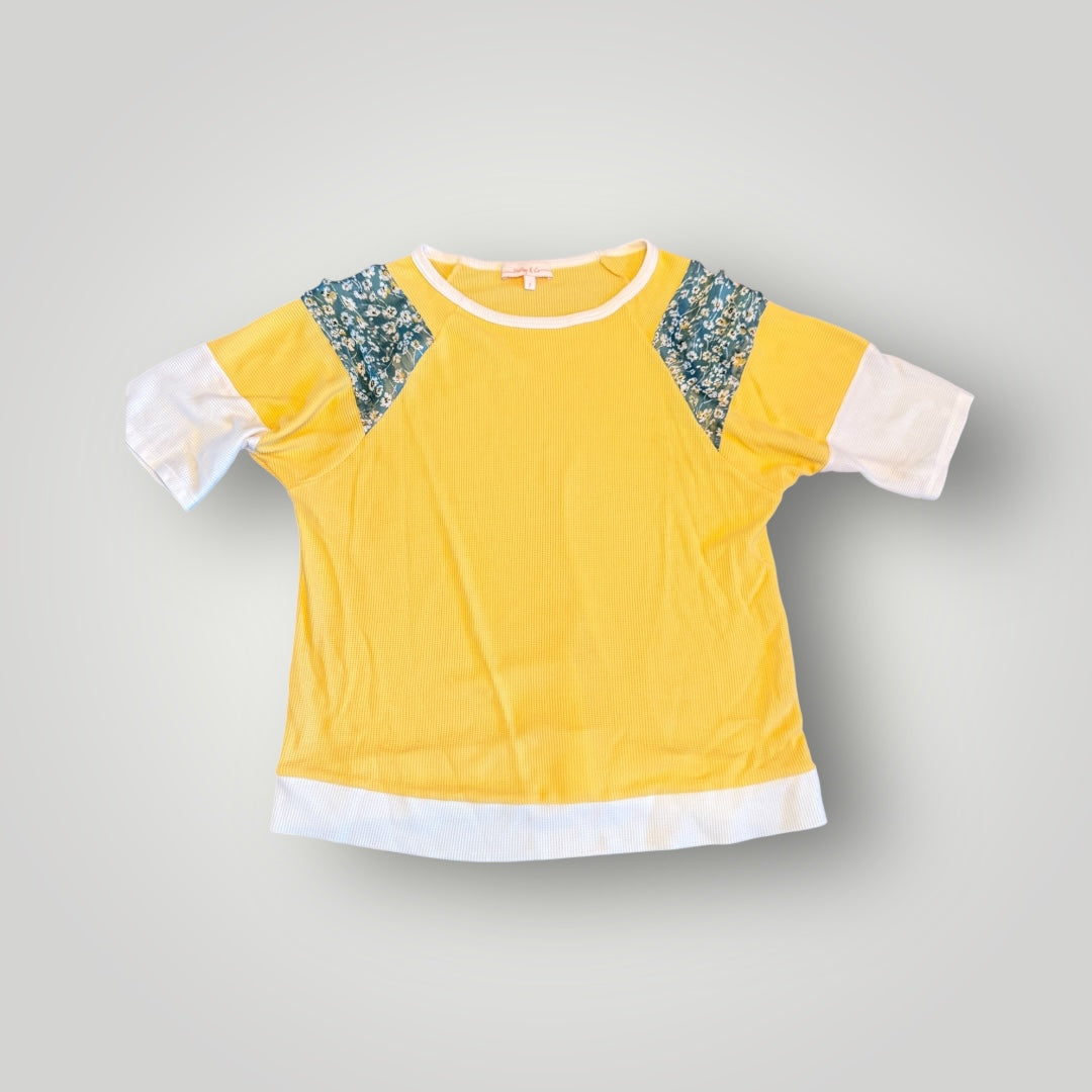 Yellow short-sleeve top with contrast white hem and sleeves, featuring blue floral shoulder panels. Lightweight and soft—perfect for spring and summer!