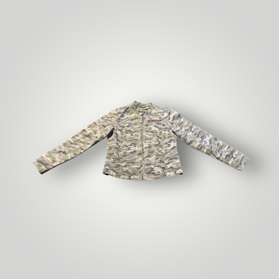 Add a bold touch to your biker style with this Harley-Davidson camo zip-up jacket. Featuring a light camouflage print with classic orange Harley-Davidson embroidery on the back and front, this jacket combines rugged attitude with a feminine fit. Made from durable cotton blend fabric, it’s perfect for layering on rides or casual outings.
