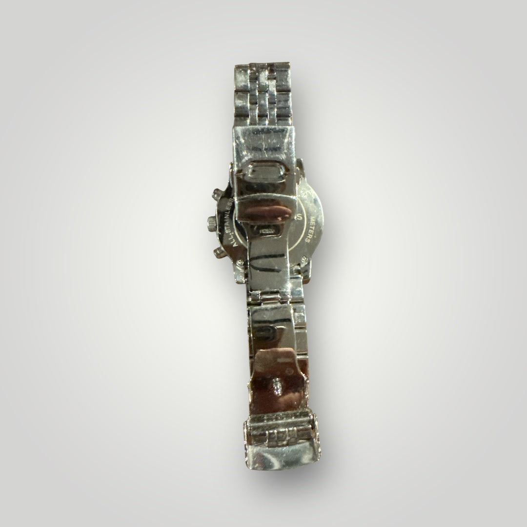 This stunning Michael Kors watch features a polished silver tone stainless steel band and bezel, complete with crystal accents for a touch of glam. The chronograph dial adds a sporty edge while maintaining classic elegance. A timeless accessory that transitions effortlessly from day to night.