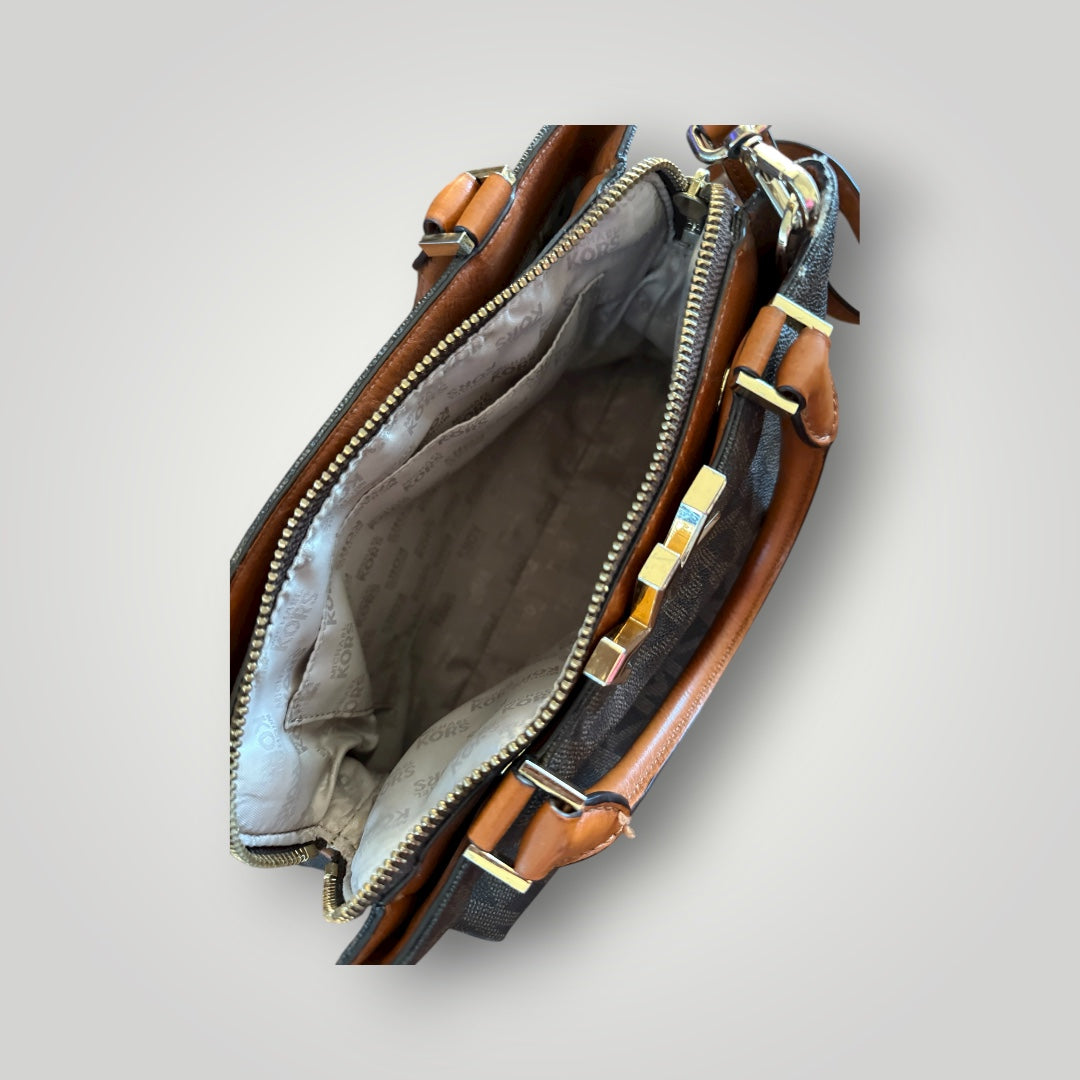 This elegant Michael Kors satchel features the signature MK monogram print in dark brown with rich tan leather handles and gold-tone hardware. Designed with a structured silhouette, it includes dual top handles, a detachable crossbody strap, and a spacious interior with multiple pockets for organization. A zip-top closure and soft fabric lining make it as practical as it is stylish — ideal for daily wear or travel.