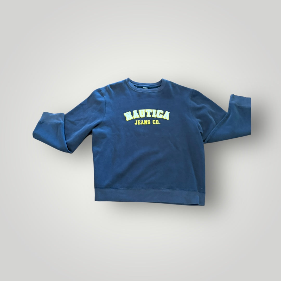 Classic navy pullover sweatshirt featuring bold yellow Nautica Jeans Co. lettering across the chest. Soft cotton blend with a relaxed fit…..great for casual days or layering.