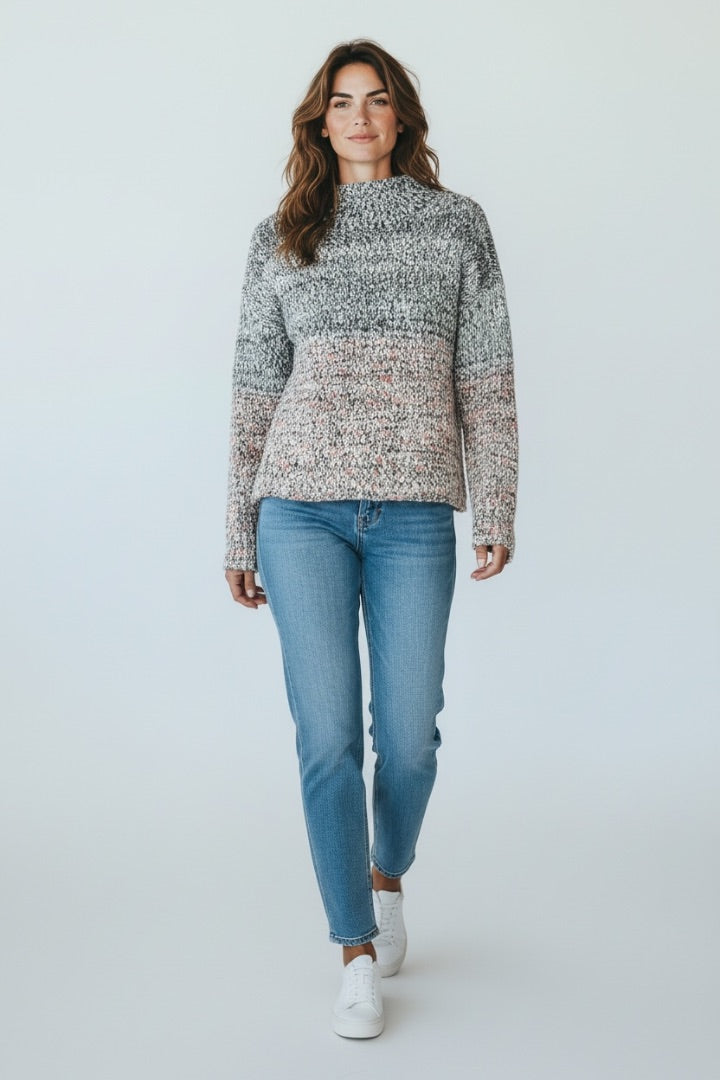 Cozy marled knit sweater featuring a mock neckline, soft colorblock pattern, and relaxed everyday fit. Warm, stylish, and perfect for casual layering.