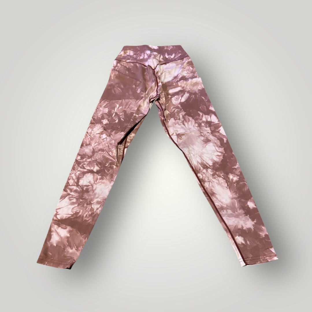 Soft, stretchy leggings with a high-rise waistband, featuring a pink and mauve tie-dye pattern.