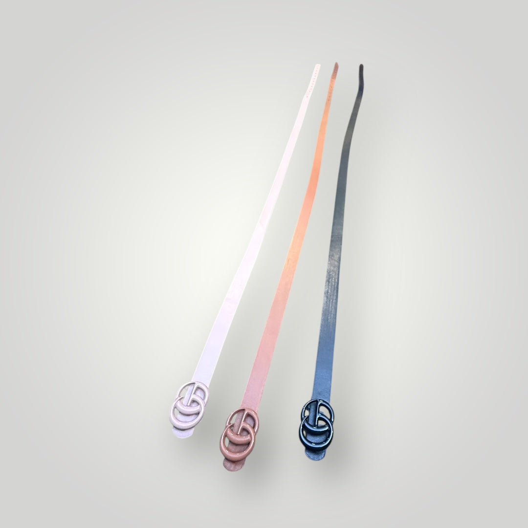 A fashionable set of three faux leather belts featuring trendy interlocking circle buckles. Comes in a versatile trio of black, blush pink, and rich cognac brown—perfect for adding a stylish finishing touch to any outfit.